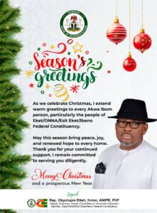 The federal lawmaker concluded by wishing all Akwa Ibom people a peaceful Christmas celebration and a prosperous New Year, assuring them of his sustained dedication to advancing their collective aspirations through responsive leadership and accountable governance.
