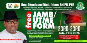 The Member representing Eket/ONNA/Esit Eket/Ibeno Federal Constituency in the House of Representatives, Rep. Okpolupm Etteh, has put modalities in place to commenced a free Joint Admissions and Matriculation Board (JAMB)/Unified Tertiary Matriculation Examination (UTME) registration exercise for prospective candidates across the federal constituency.
